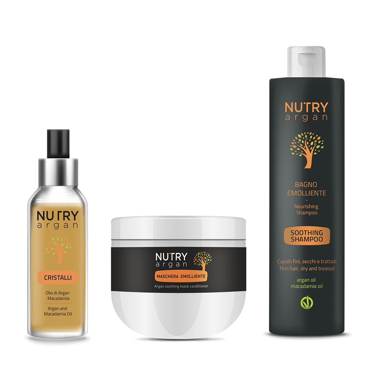 NUTRY Argan è una soluzione professionale antiossidante, emolliente ed elasticizzante pensato per restituire nutrimento, forza e luce ai capelli secchi, opachi, crespi o sfibrati. Le formulazioni, arricchite con olio di argan e olio di macadamia (ricchi di vitamina E e acidi grassi), combattono lo stress ossidativo, levigano le cuticole e rimpolpano la fibra migliorandone elasticità e resistenza. Il risultato è una chioma morbida, disciplinata e brillante, con crescente pettinabilità e un visibile effetto anti-crespo e anti-secco.