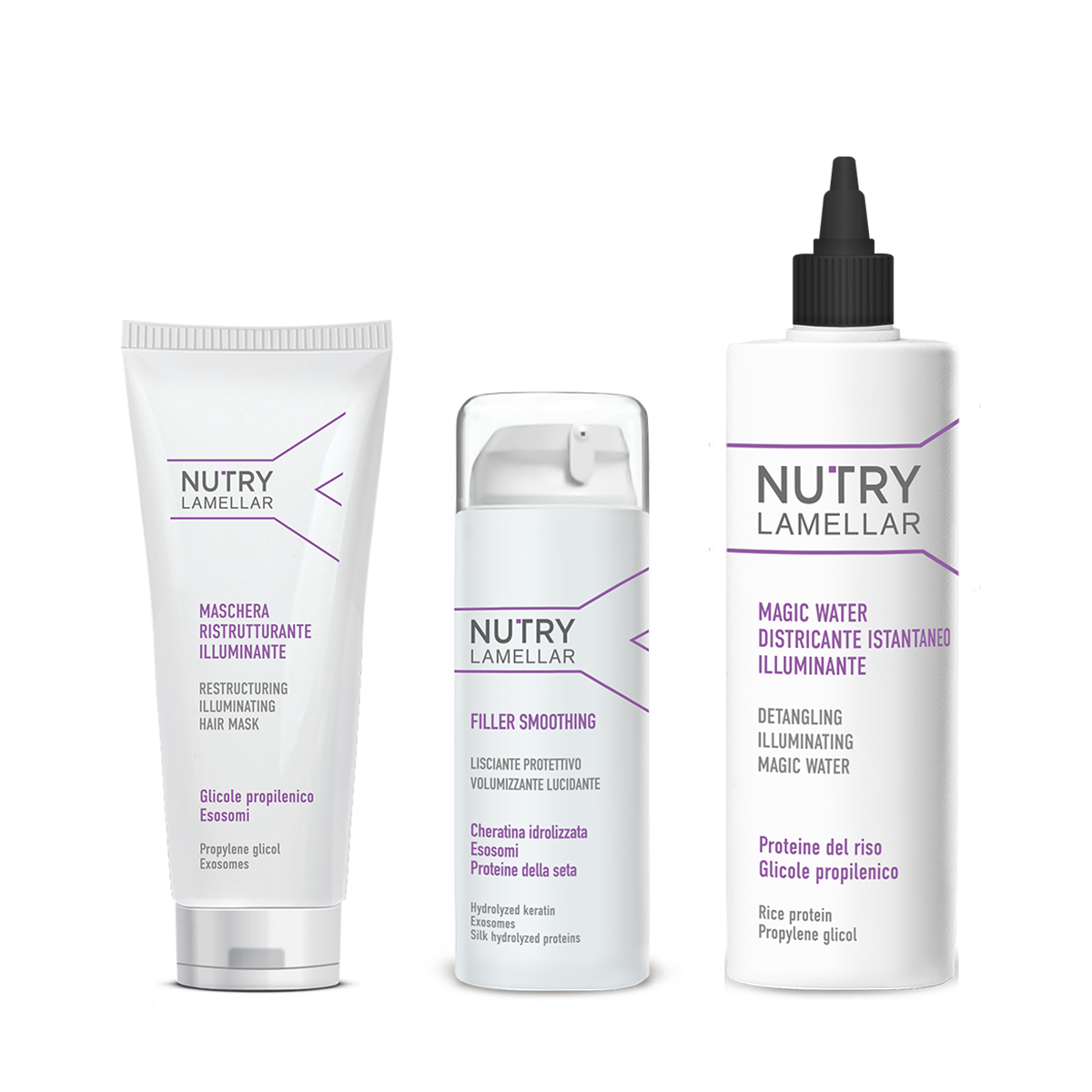 NUTRY Lamellar è il trattamento di laminazione rapida che regala lucentezza “a specchio” e morbidezza immediata senza appesantire. La sua tecnologia lamellare, ricca di agenti laminanti, emollienti, idratanti e districanti, scorre sulla fibra, riempie le micro-porosità e allinea le cuticole in strati sottili. La superficie del capello risulta più liscia, compatta e capace di riflettere meglio la luce. In pochi minuti riduce il crespo, sigilla le punte, facilita il districamento e migliora l’elasticità, lasciando i capelli setosi, disciplinati e luminosissimi. Indicata su tutte le tipologiedi capelli, da quelli fini che tendno a perdere corpo ai capelli crespi e sfibrati. Il trattamento NUTRY Lamellar dona leggerezza e scorrevolezza senza residui.