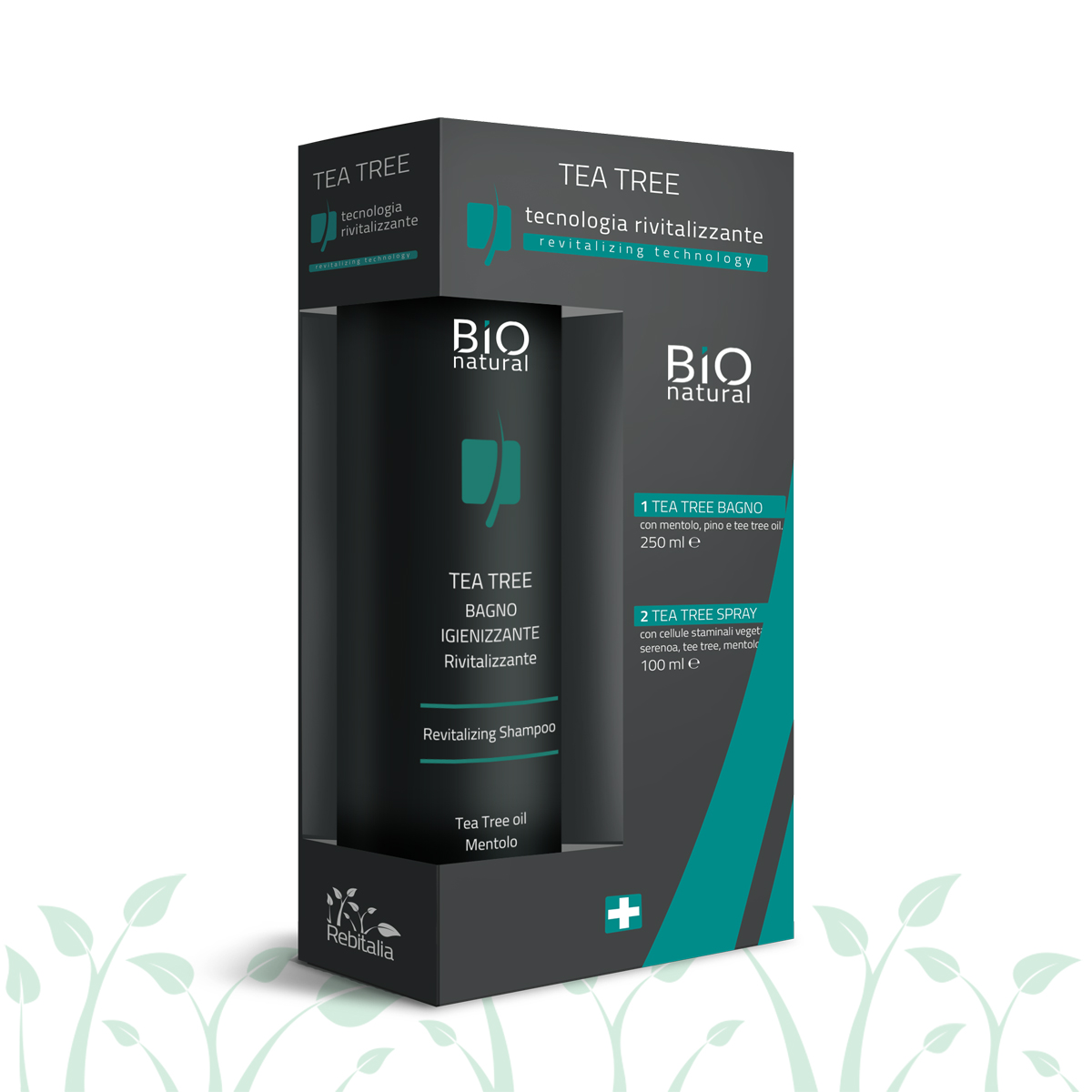 Kit tecnologia rivitalizzante: Tea tree bagno con mentolo, pino e tea tree oil e Tea tree spray con cellule staminali vegetali, serenoa, tea tree e mentolo – Shampoo e lozione